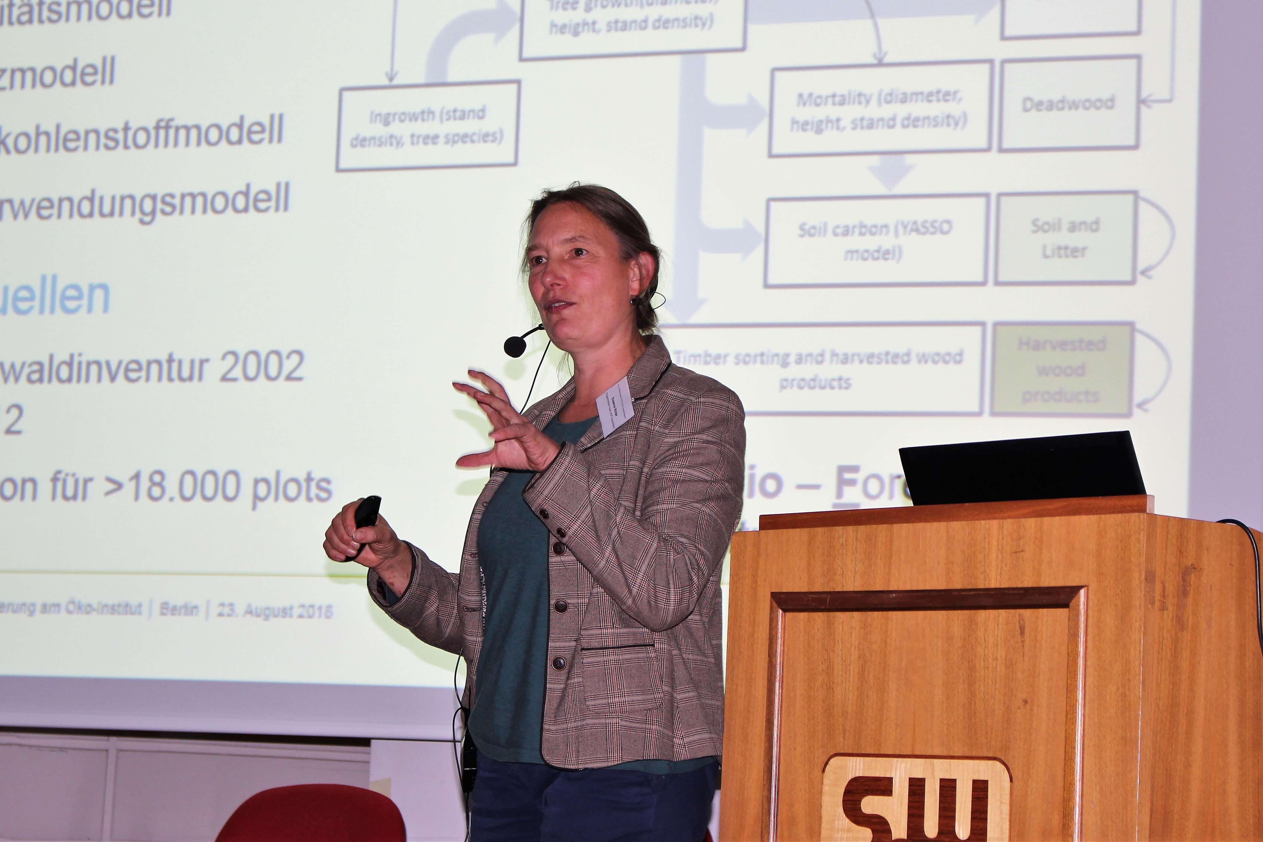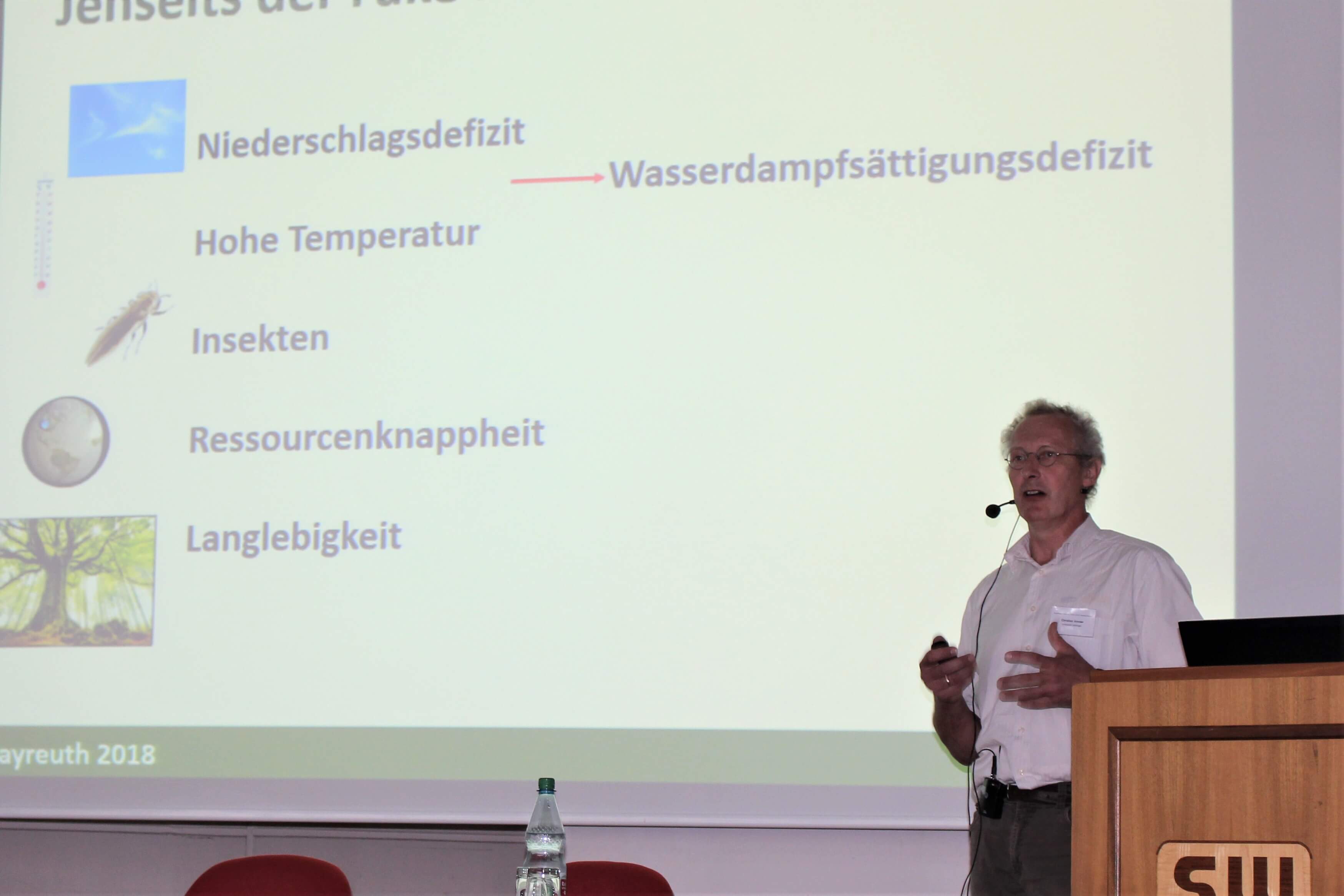 Next, Christian Ammer from the University of Göttingen talks about “How climate change affects the ecosystem of the forests and how silviculture can react to that”. He first lists some of the challenges and obstacles, the forest has to deal with today: deficits in precipitation, rising temperatures, more insect infestations and also the long lifespan of forests which makes them more vulnerable. “There are two scenarios: either the forests can adapt – or they can’t”, Ammer says. No matter which scenario will occur, there will be reductions in growth and altered mortalities. “I will present you a typical lumberjack – my former neighbour Sepp”, Ammer says, showing a picture of a middle-aged man in green overalls, standing in the middle of a forest. People like Sepp are now dealing with the questions how to treat their forests. Ammer talks about adaption: Mixed forests are more flexible, they recover faster from dry years than pure stands. Not only from an ecological but also from an economic point of view, mixed stands show positive effects to climate change. Indigenous species that are adapting well to climate change are the grand fir and the European black pine. “I totally failed in trying to persuade Sepp to plant some of them”, he says, causing quite some laughter in the audience. “His grandfather didn’t do that, his father neither – so why should he? You see, it isn’t always easy to change something.” But Sepp’s daughter listened to Ammer’s words and started planting some of the adapting species. Also, the thinning of the forest could reduce the risk of drought stress in young spruces, he says. Ammer concludes that the choice of tree species and crop treatment can help with the adaptation to climate change. But he also mentions that these actions are just to reduce the symptoms of a bigger problem: the human influence. “How many of you did come here by car today?”, he asks in the end of his talk. An embarrassed silence fills the room.