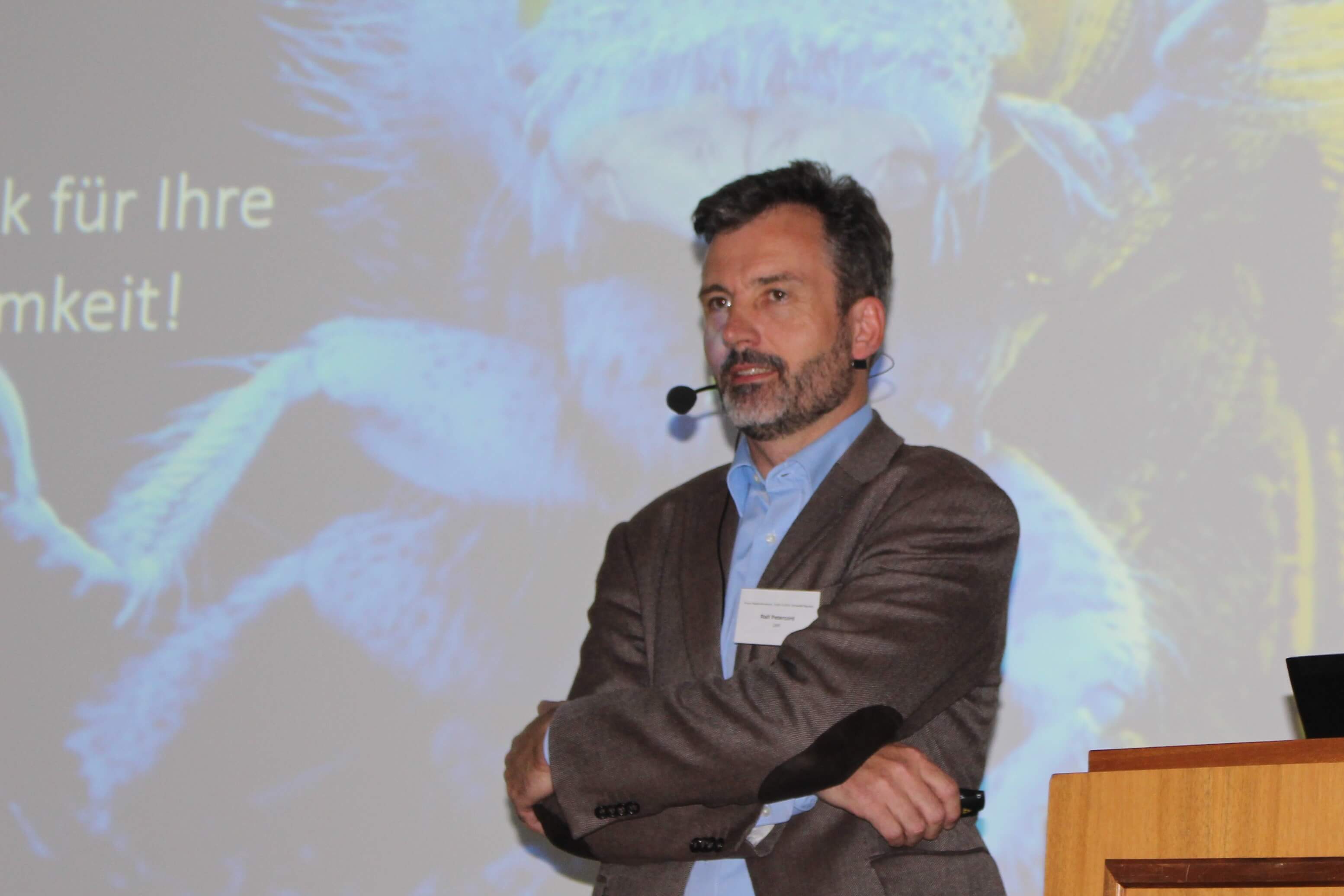 After a short break, Ralf Petercord from the Bavarian office for Forests and Forestry gives the probably most emotional talk of the conference: “Which new pests and tree diseases are brought by climate change?” Petercord uses a lot of empathy and irony while talking about different insect and fungus calamities. “The bark beetle is definitely not interested in how the weather is behaving tomorrow or in 10 years – it is interested in the weather today”, he says. As the previous speakers, also he mentions the unusually warm winters and extremely hot summers which occur in ever shorter intervals. The reactions of insects and fungi to climate change are various: They show different distribution patterns, a decreased generation time and a broader host range which means that they can attack more different species. With figures on various slides, he shows how the bark beetle population and also their effects on trees have increased after very warm years – the heat summer of 2003 is a very indicative marker – but there is a general increase visible since 2015. Also, the Oak Processionary Moth has changed its distribution dramatically: “In 2007, this moth was listed as an endangered species in Upper Franconia – today you can find it almost all over Bavaria!”, Petercord says, gesticulating on the stage. The Gypsy Moth causes huge damages in forests as well: Their complete defoliation leads to a thin canopy – due to the missing shade many young birds die in their nests. “Our forests are dying! We have to do something so that they can recover”, Petercord says, putting quite a lot of emotion in his words. As one of the strategies to handle pests he names that we all have to reduce our consumption of wood: According to Petercord, every German person uses about 600 Gramms of wood every day. Also, using pesticides in forests should be an option for him. When a member of the audience asks what he thinks about the insects’ demise, he answers: “I think, the insects’ demise is not only caused by pesticides but by the fact that we are driving around in SUVs in the city and want cheaper food all the time. First, I talk about the poor insects – and then I want to have my 500 gramms of meat from Aldi for 2,63 Euro!?” These words are greeted with tumultuous applause by the audience.