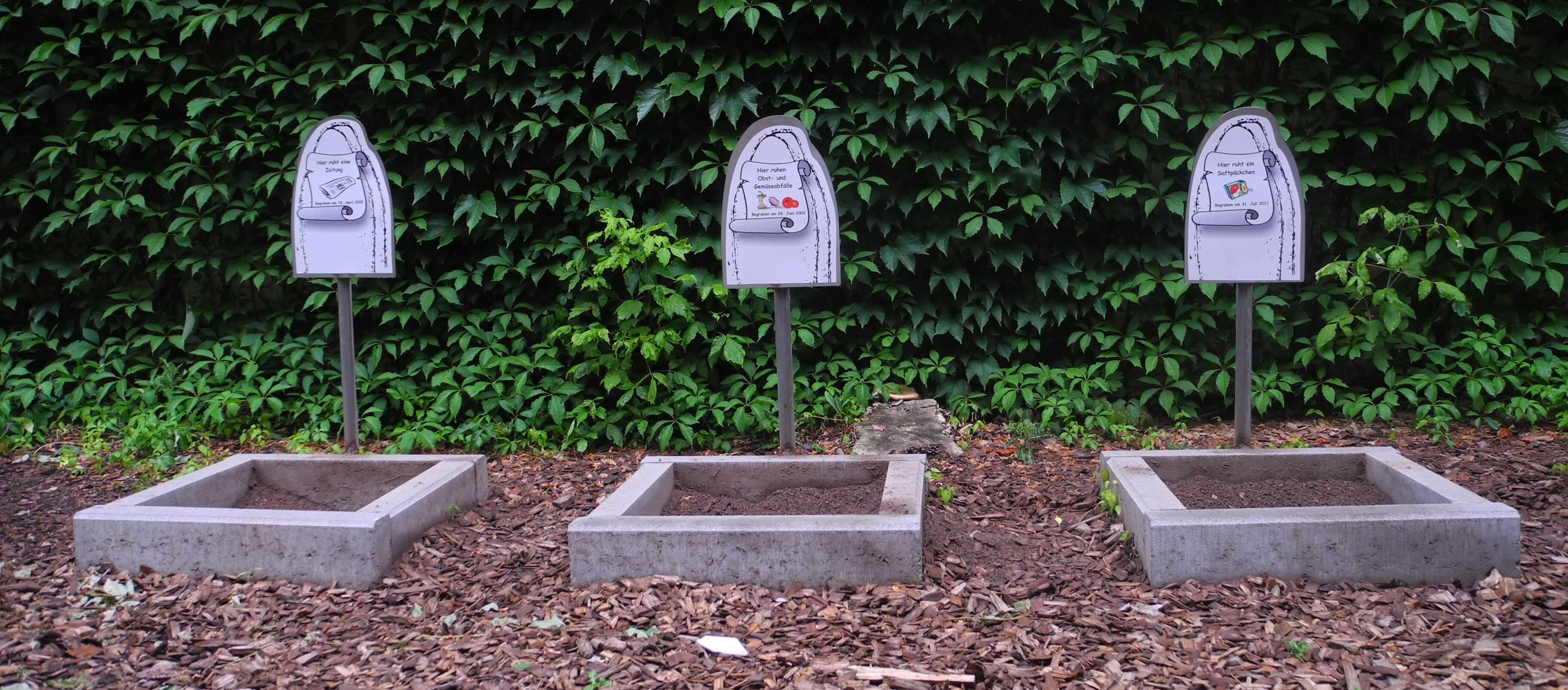 8 small graves are neatly lined up in the corner of the garden. Each one furnished with a picture and a date of burial. Next to the graves, there lies a shovel, meant to dig into the graves. But this is not the scene of a desecration of a grave – you wouldn’t find corpses in the graves, but trash. Trash, buried ten, twelve, eighteen years ago. What will be left?