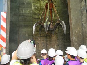 During their day at the GML, the visitors get a tour through the plant and learn how the waste can still be used and what happens with the leftover slag. 200 000 tons of waste, more precisely residual waste, are delivered every year – produced by 800.000 people. Up to 110 trucks are arriving every day, loading off the waste of Ludwigshafen but also of other near cities. The visitors get a chance to catch a glimpse into the refuse bunker and see the enormous cranes at work. They can also meet the crane operators and observe closely how they grab the waste and toss it into the combustion chamber. The waste is burned twenty-four hours a day, seven days a week, as it is quite expensive to shut the plant down. The temperatures in the oven reach up to 1000 °C – enough to burn plastic and aluminum, but not enough to melt iron. The emerging heat is then used to produce energy and district heat. Up to 70 million kWh can be produced in the plant every year – that is enough to provide 17500 average households (four persons) with energy. But besides energy also 60 000 tons of slag (i.e. the ash that is left over after burning) are produced every year. As there are still toxic substances left in the slag, it is quite hard to put it to a good use. A certain part is used for road construction, the rest has to be stored in huge landfills.