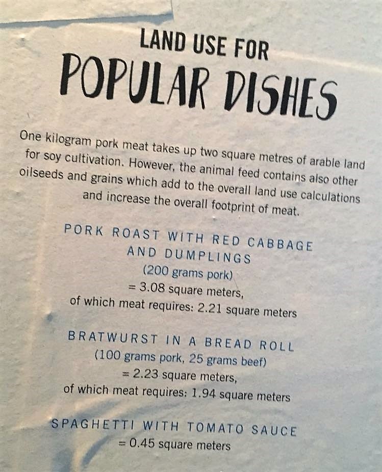 The quoted number is used to feed pigs, cows and poultry. One meal of traditional roast pork alone destroys two square metres of potential macaw habitat. According to the fact sheets at the exhibition, the entire German Federal State of Thuringia would need to be converted to arable land with soybeans to satisfy the meat industry’s demand for this fodder.
