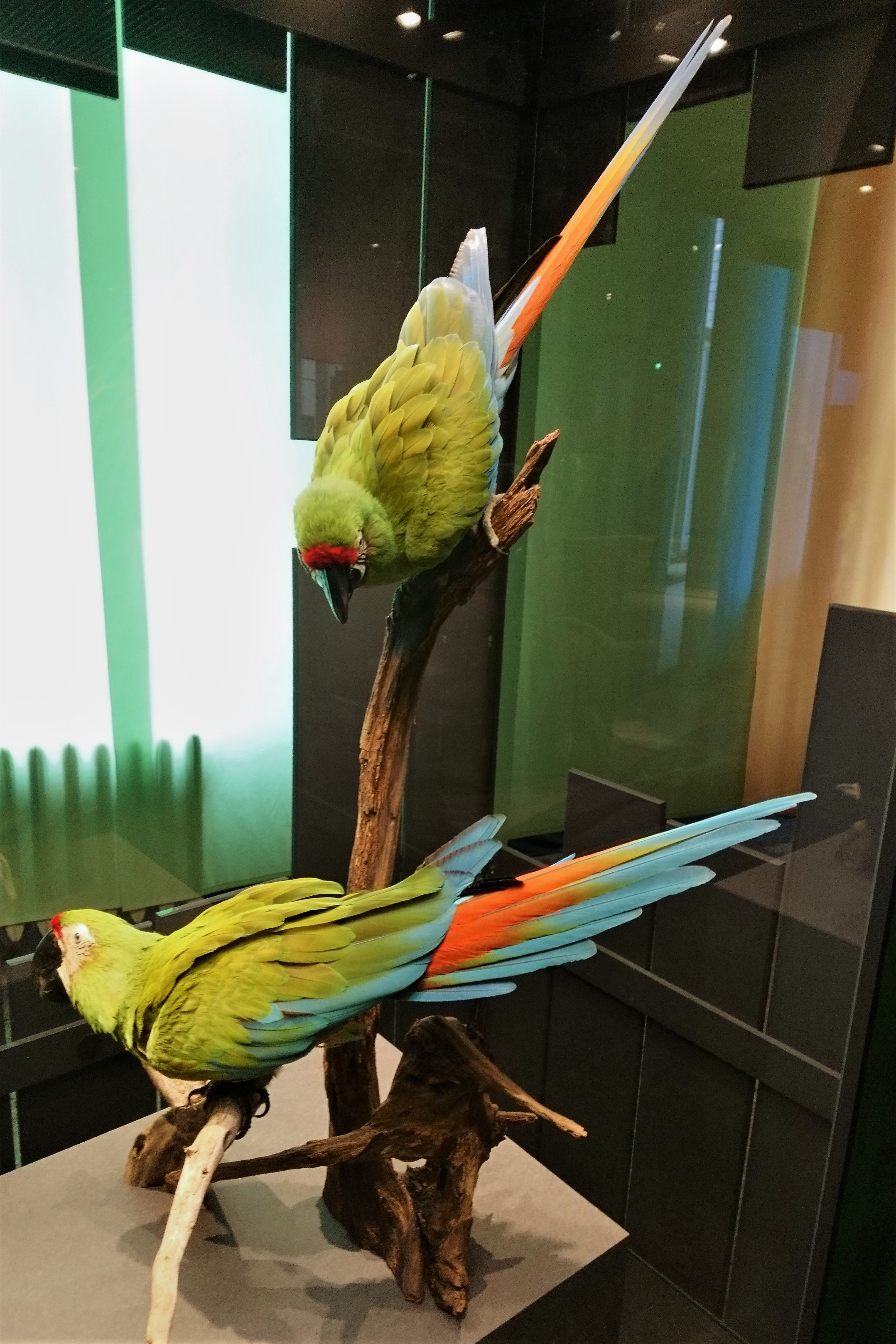 Since May 2017 the Natural History Museum of Berlin, Germany, showcases a special exhibition focusing on Macaws (Aras). Right after passing by gigantic dinosaur skeletons in the entrance of the museum, the visitor enters a room with a South American atmosphere and dozens of colorful specimens of Macaws.