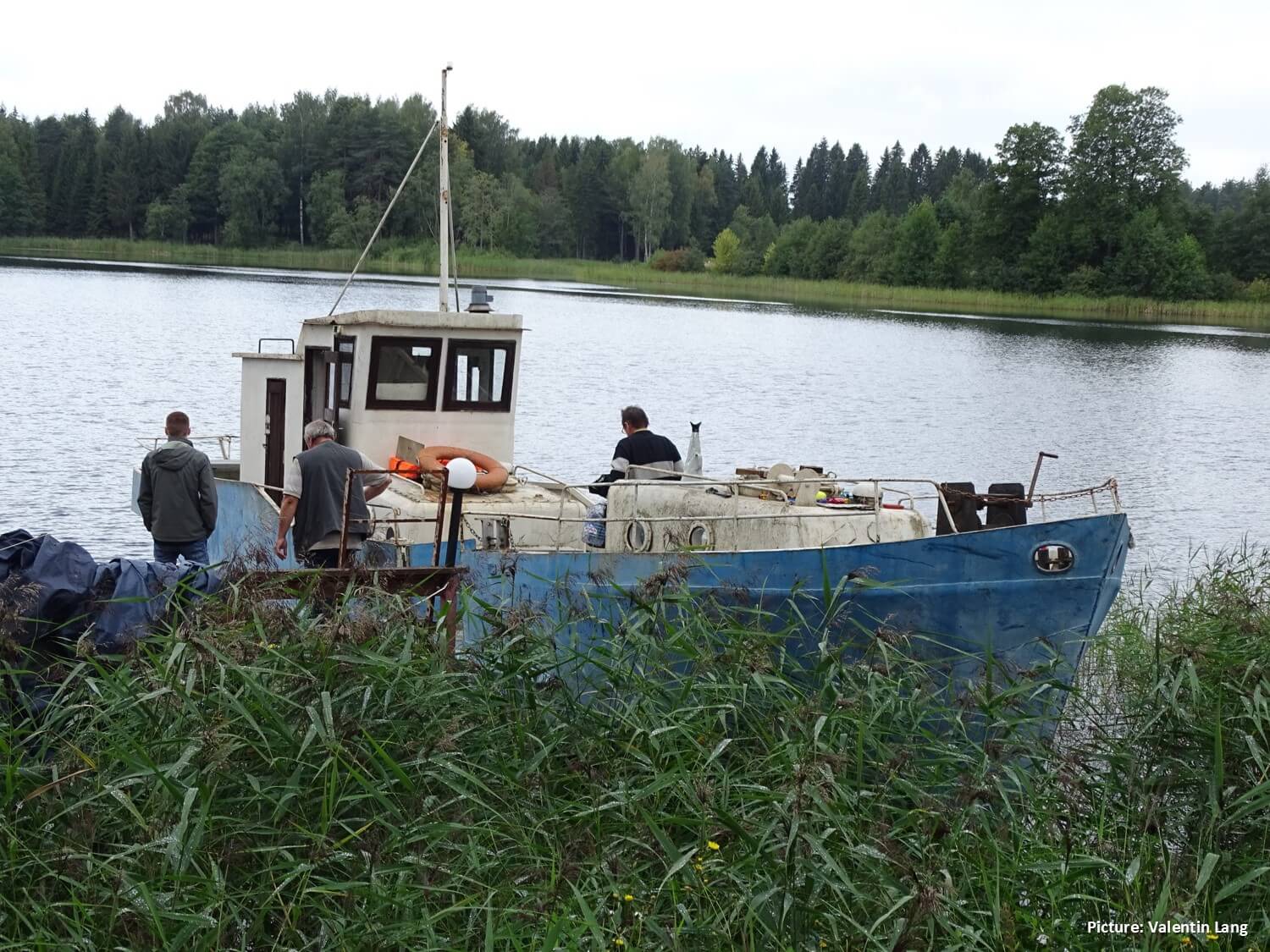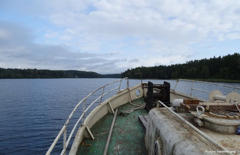 Earlier the same day when we had to stop taking photos, we follow two scientists of the institute and the captain on the cutter-like ship. It is a partly cloudy day, the sun is sparkling on the water surface most of the time. During the next hours, the ship will travel to three fixed sample areas on Uzhin Lake and Lake Valdayskoye. The sample areas are differing in size of the respective lake (which affects the influence of the wind speed) and proximity to the next city (which affects the influence of human activities). In every sample area, the transparency of water, photosynthesis, the amounts of nitrogen and phosphor and the temperature are measured every ten days. By taking samples, one of the scientists is telling us that they have to manage their research with a small amount of money. For instance, they are still using some older instruments and had to stop to measure the pH value of the water since the instrument has broken.