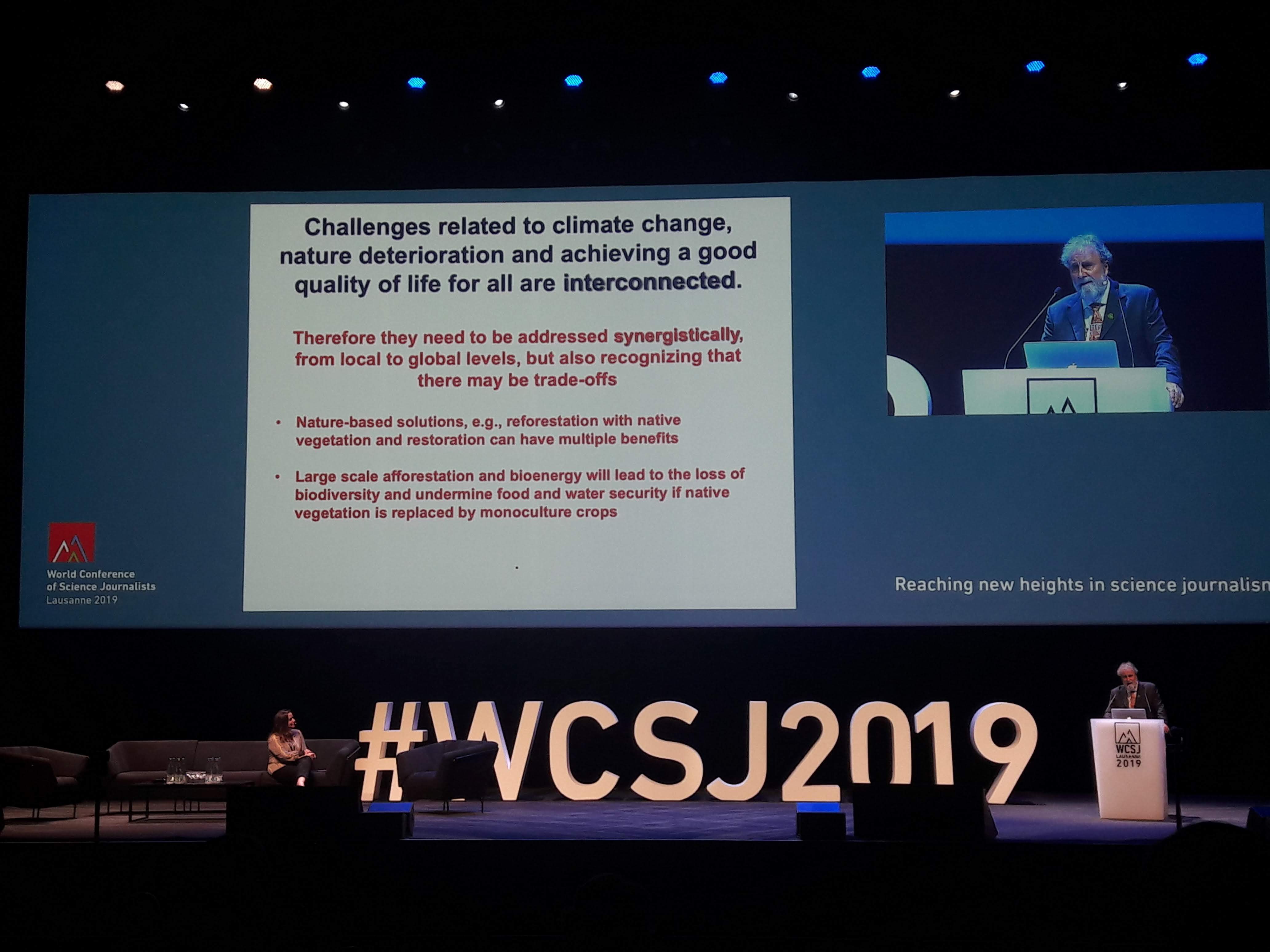 The spectrum of talks, panel discussions, workshops and presentations was broad. There were three big auditoriums, hosting one major event after the other with a variety of topics. “The new goldrush: Prospects and controversies in deep seabed mining”, “Fake-news in science: How to recognize and fight it” or “Biodiversity: Reporting a silent crisis” – there was something for everyone. Researchers and science journalist from all over the world came together, discussed possible solutions for different challenges. Not all speakers could attend the conference physically, which is why some of them were called in via Skype. During a talk about marine protection, a number of researchers took part in a panel discussion, some of them sitting in chairs at the beach on a small island in the Indian Ocean, their feet in the white sand, the sound of the waves in the background echoing in the big hall in Lausanne. One of the highlights of the conference was the talk of the Intergovernmental Panel on Climate Change (IPCC) chairman Hoesung Lee. The auditorium was jam-packed, everyone wanted to hear what he had to say. He spoke about the findings of the current report on 1.5°C warming. He especially pointed out the necessity of combining different fields of research: “We have a good understanding of the technological and economic feasibility, but the social dimensions leave room for more knowledge”, Hoesung says. “We need a change in behaviour. We need a different economy.” He also talks about the choices in private and daily life. Particularly, he emphasizes the need for better infrastructure in remote areas: “Public transportation in cities is often very good. But in the countryside, you often have no choice.” Yet, one aspect he is not talking about – even when asked from the audience – is a change in diet. Even though it is well known that the meat consumption is one of the main reasons for greenhouse gas emissions. “What food choices people make, is not our area.”