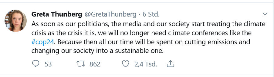 Greta Thunberg now is a hero at the COP24, the UN conference on climate change that currently is taking place in Kattowice, Poland where the world is negotiating solutions for climate change. After the Paris Agreement in 2015, the last years of the COP didn’t have a very groundbreaking outcome. In Kattowice, Greta gives the adults a telling: The absence of some country leaders, for example US President Donald Trump or German Chancellor Angela Merkel, “shows what they prioritize”. About the same politicians she said that “In the future, we will look back, and we will either laugh at them or we will hate them.”