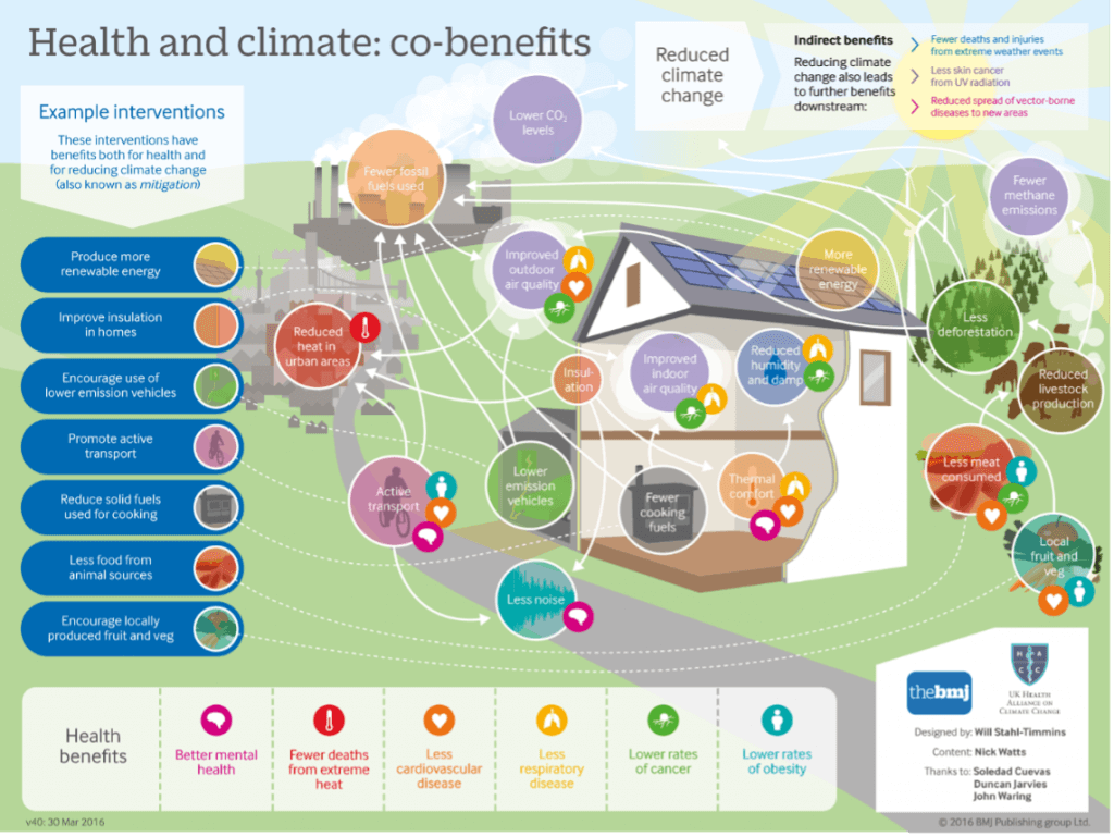 Besides preventing or mitigating the adverse effects of global change on health, there are many co-benefits of climate action for human health. For example, living a more climate-friendly life by reducing meat consumption, rather than walking and biking places instead of going by car, we also experience somewhat unintentional “side”-effects. Eating a healthier diet, living a more active life, and reducing air pollution leads to a lower risk of morbidity and mortality. Figure 2 shows these relationships in more detail.
