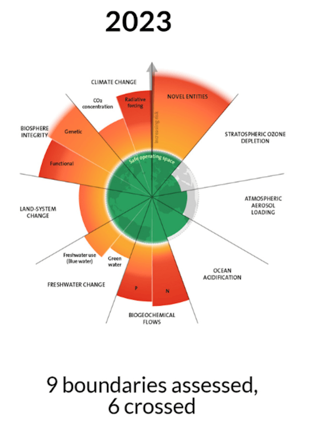 We are now in an epoch that many scientists call the Anthropocene – a geochronological epoch shaped by humans as the central driving force within the planetary system. The concept of planetary boundaries introduced by Johan Rockström and other scientists in 2009 reflects these impacts. These boundaries are basically “nine processes that regulate the stability and resilience of the Earth system” and due to human activities six of the nine boundaries have been crossed (Fig. 1). Moreover, eight of the nine boundaries, except for ozone, are moving into a concerning direction, i.e. further away from what’s considered a safe space. Leaving the safe space increases the risk of big and potentially permanent changes to our environment.