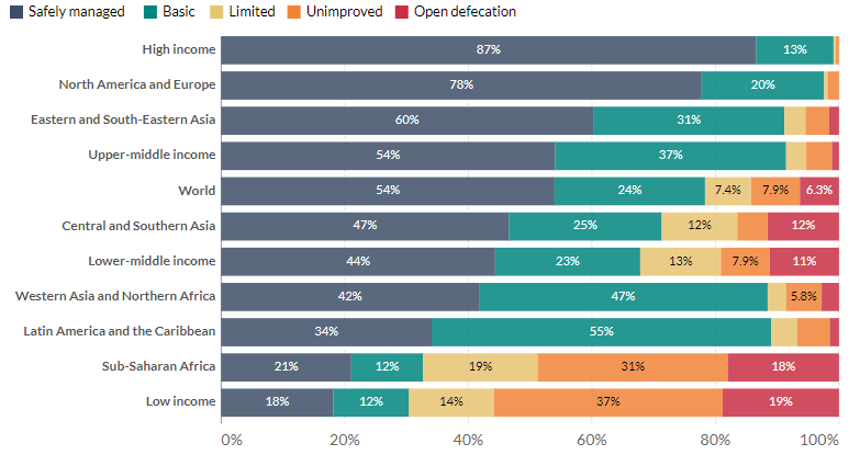 In 2020, officials recorded that 2 billion people (or 26% of the global population) lack access to safe potable water, and 3.6 billion people (or 46% of the global population) do not have access to safely managed sanitation facilities [4]. Access to clean drinking water and sanitation infrastructure is closely linked to health. In fact, a study conducted by the World Health Organization (WHO) in 2012 concluded that every US$1.00 invested in sanitation would result in a return of US$5.50 in lower costs for health systems, increasing productivity, and preventing premature deaths [5]. According to WHO data, the region most affected by sanitation deficiency is Sub-Saharan Africa, where 12% of the population has access to basic sanitation facilities, 19% has a limited structure available, 31% has the use of an unimproved system, and 18% practices open defecation (Figure 1). Additionally, other regions that have less than 50% of their population with access to safely managed sanitation systems include: Latin America and Caribbean, Western Asia and Northern Africa, and Central and Southern Asia.