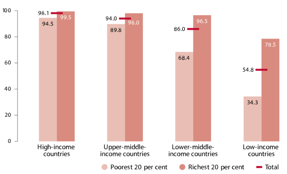 However, progress in SDG 4 is not coming fast enough – projections estimate that education targets will not be met by 2030 [6, 8]. A major problem is that access to education is not evenly distributed among all: vulnerable groups face many more barriers to education. For example, low-income countries show lower primary school completion rates relative to middle- or high- income countries (Figure 1). In lower income countries, the difference in education completion between the rich and poor is also greater. Furthermore, women and girls, as well as people with disabilities, have higher rates of illiteracy and school-leaving, particularly in lower-income countries and disadvantaged communities [6, 8]. This situation has only gotten worse with the COVID-19 pandemic.