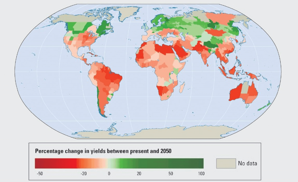 Especially tropical areas will experience a decline in yields (Figure 2) [11]. Many of those regions, like some African countries, will thus face a three-part challenge: first, present high levels of malnutrition; second, a projected population growth; and third, significant yield losses caused by global warming.