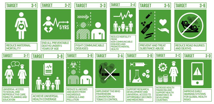 The SDG 3 presents thirteen targets [1]. They cover a wide range of health issues, from maternal mortality prevention, mental health, prevention and treatment of substance abuse, reduction of illnesses and deaths caused by hazardous chemicals and pollution, to the achievement of universal health coverage. These targets are aligned with the World Health Organization’s definition of health, namely a state of complete physical, mental and social well-being, and a fundamental right for every human being regardless of race, religion, political belief, economic or social condition [2].